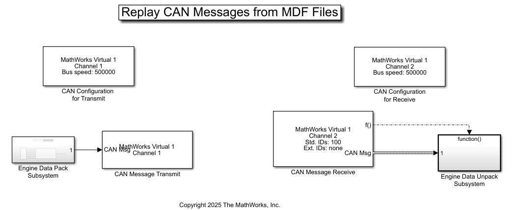 This example shows you how to replay CAN messages contained in MDF files using MathWorks® Virtual CAN channels in Simulink®. You can update this model to connect to supported hardware on your system.