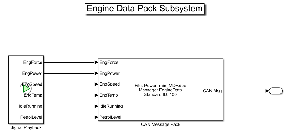 • A Pack subsystem that feeds the input signal data to a CAN Pack block to be packed into CAN messages using the DBC file.