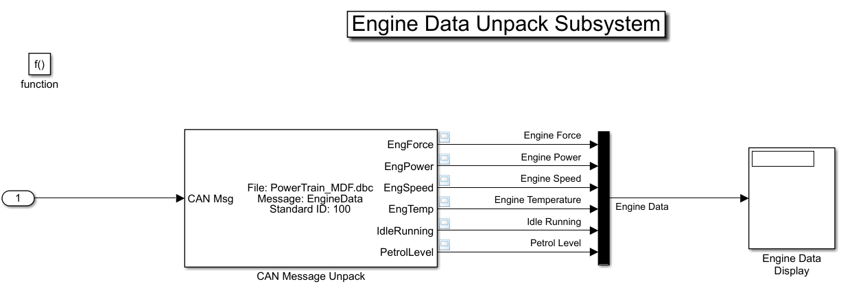 The Engine Data Unpack subsystem unpacks the engine data information from the received CAN messages and plots them to a scope.