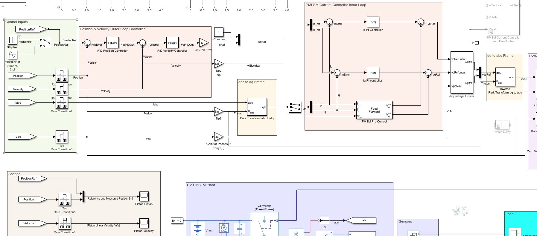 Its regarding a PMSM linear machine model, with a cascade (position and speed) outer loop and a current controller inner loop (Id and Iq currents).
