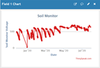 • Record and visualize your experiment's data in ThingSpeak channels. For example, this public soil monitor channel shows measurements from a sensor connected to a plant. You can see the ThingSpeak example pages for help getting your experiment connected.