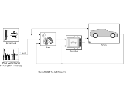 This project features a high-performance electric vehicle (EV) model with a dual-motor (2EM) architecture, developed using Powertrain Blockset™. This model leverages a set of enhanced component models to achieve high-speed simulation, executing thousands of times faster than real-time.