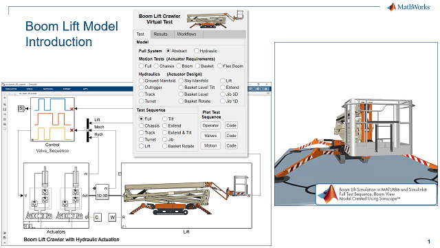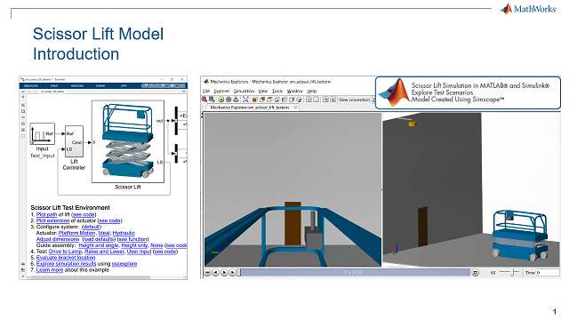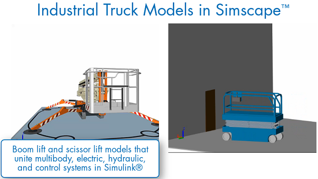 Simscape enables engineers to optimize the design of industrial trucks, including boom lifts, scissor lifts, forklifts, and other equipment for elevating people and moving goods. You can tailor Simscape models to your exact design and explore the entire design space. Use the examples linked from this page to refine design requirements, design control algorithms, and test controller software without relying on hardware prototypes. MATLAB apps help you configure models to test for compliance with government regulations.